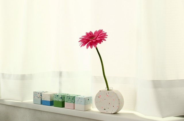 「ジェスモナイト」という水性樹脂でできたカラフルな一輪挿し。 手触りはすべすべとしており、石や焼き物のようにシャープな中にも温かみのある質感が特徴です。 自然な質感のジェスモナイトは、植物などの自然物との相性がとても良く、主役となるお花の美しさをより引き立ててくれます。 カラーは【ライトグリーン・ホワイト】 ライトグリーンとホワイトの組み合わせが、とても明るく元気の出る配色となっています。 表面の模様は、「テラゾー模様」と呼ばれ、表面を丁寧に削り出すことで浮かび上がってくる模様です。 削り出すまではどのような模様が現れるか作り手にも分からず、同じものは一つとしてない模様が魅力の一つです。 日々の生活を彩るワンポイントインテリアとしていかがでしょうか。 生けるお花によってもまた違った印象になるので、いろいろなお花とお楽しみいただけます。 形は、サークル型とドロップ型の二種類。 ご購入の際、ご希望の形をお選びください。 ご希望の場合、無料でリボンを掛けさせていただきますので、メッセージにてお知らせください。 【サイズと重さ】 ・サークル 高さ約75㎜(試験管部分を含む)×幅約82㎜×厚さ約28㎜ 199g ・ドロップ 高さ約80㎜(試験管部分を含む)×幅約55㎜ 167g 【発送の目安について】 入金確認後(後払いの場合はご注文後)4日以内(レターパックの場合、郵便局発送のできない土日祝は含まず)とさせていただいております。 【作品のオーダーについて】 私の作品をご覧いただいた上で、「こんなもの作れないかな?」「これの色違いがあったらいいな」「こんな場所に飾れるものがあればいいな」などご要望、ご質問、ご意見などありましたら是非メッセージにてお問合せください。ぼんやりとしたイメージでも大丈夫です。自宅の一室で制作している関係で、作れるものの制約はありますが、できる範囲で形にしていきたいと思っています。 【ご購入・ご使用の際の注意点】 ・ジェスモナイトという素材の特性上、表面に気泡が残っています。 ・色合いはモニターによって多少異なって見える場合があります。 ・本品は、中のガラス製の試験管に水を入れてお使いいただくものです。試験管を外した状態で直接水を入れることは想定しておりませんのでご了承ください。 ・ギフトの場合、無料にてリボンを掛けさせていただきます。メッセージにてお知らせください。 ・他の販売サイトでも同時販売しており、その都度、手動で在庫表示を管理しております。ご注文が重なってしまった場合は大変申し訳ありませんが早くご注文を頂いた方を優先させていただきます。 ・その他、ご要望ご質問などございましたらできる範囲でお応えしたいので、直接メッセージをいただけますと幸いです。 【配送方法の違いをご確認ください】※どちらも対面受け取りが必要です 〇レターパック 追跡【可】 保証、ワレモノ指定、日時指定【不可】 〇宅急便 追跡、保証、ワレモノ指定、時間指定 【可】 ①8:00~12:00、②14:00~16:00、③16:00~18:00、④18:00~20:00、⑤20:00~21:00よりお選びください。お知らせがない場合は指定なしとさせていただきます。(日にち指定はご相談ください) 【作品のオーダーについて】 私の作品をご覧いただいた上で、「こんなもの作れないかな?」「これの色違いがあったらいいな」「こんな場所に飾れるものがあればいいな」などご要望、ご質問、ご意見などありましたら是非メッセージにてお問合せください。ぼんやりとしたイメージでも大丈夫です。自宅の一室で制作している関係で、作れるものの制約はありますが、できる範囲で形にしていきたいと思っています。
