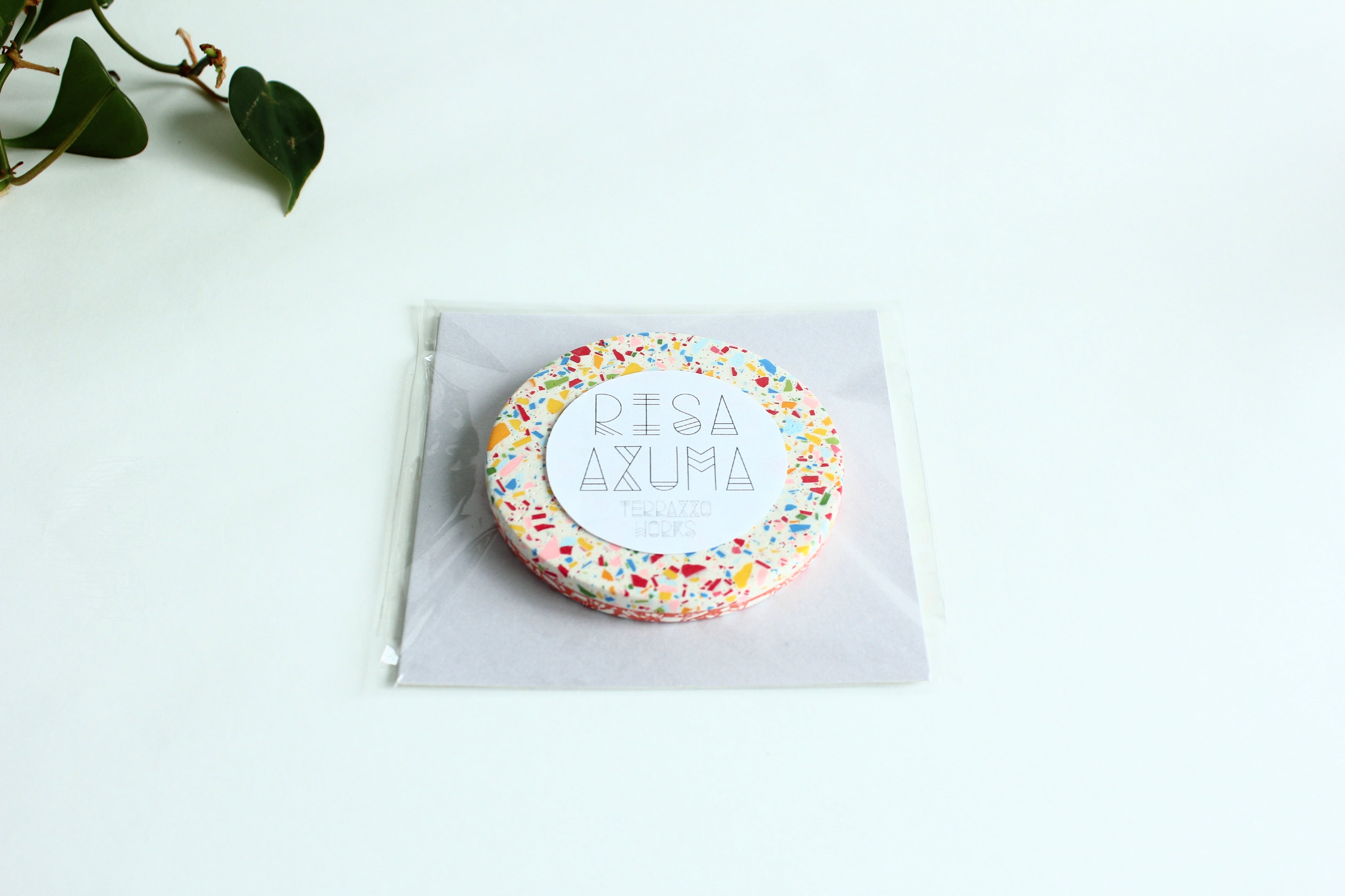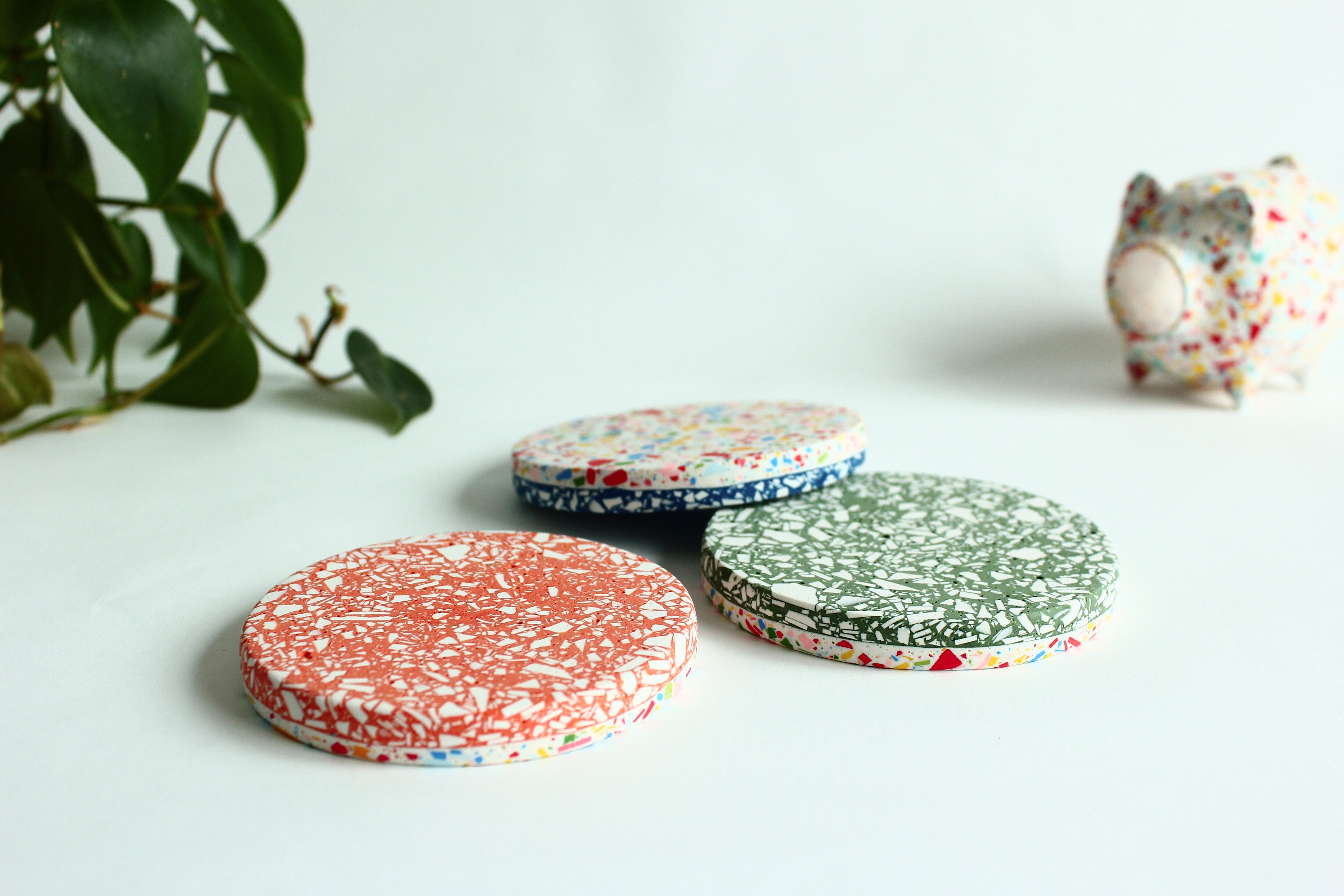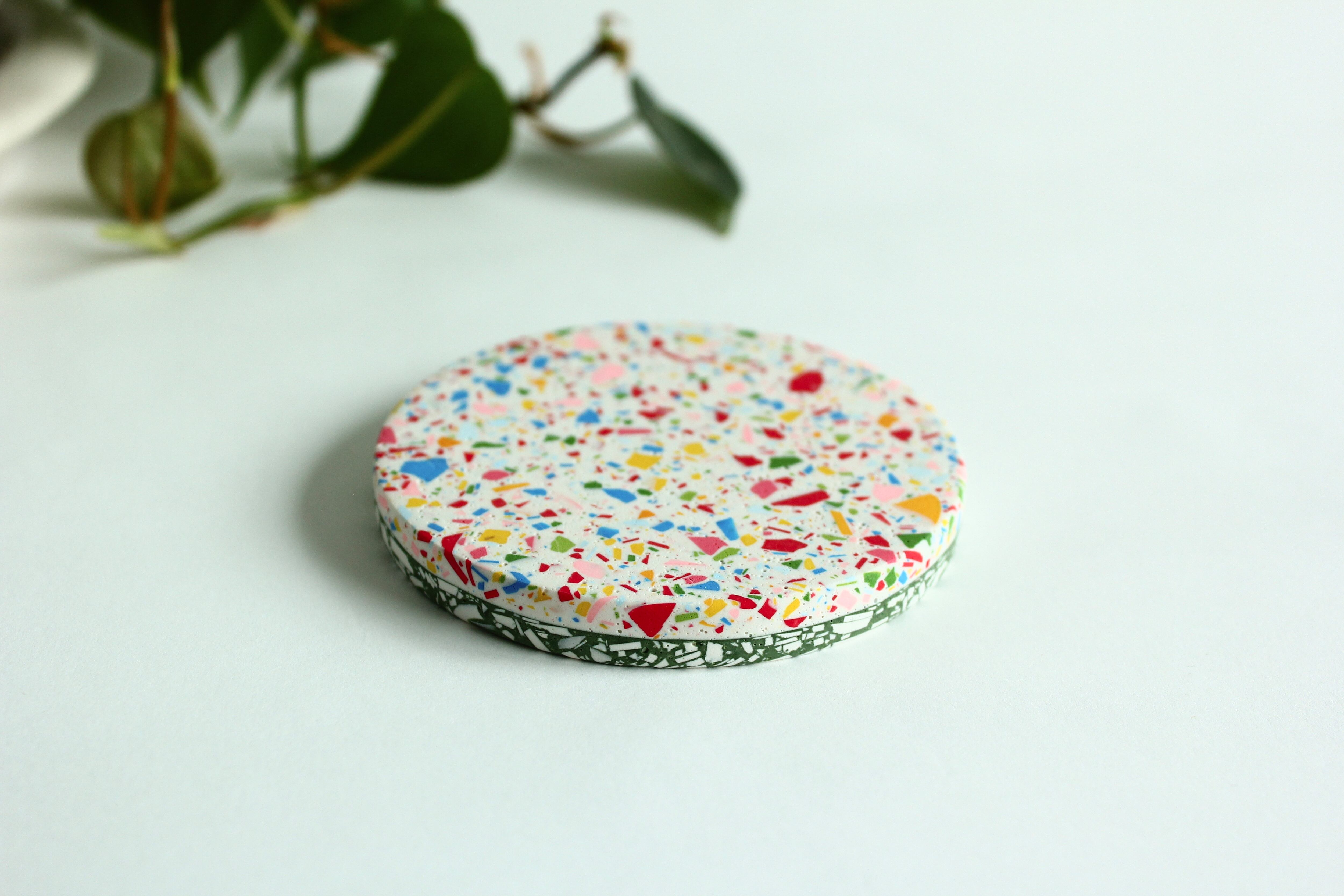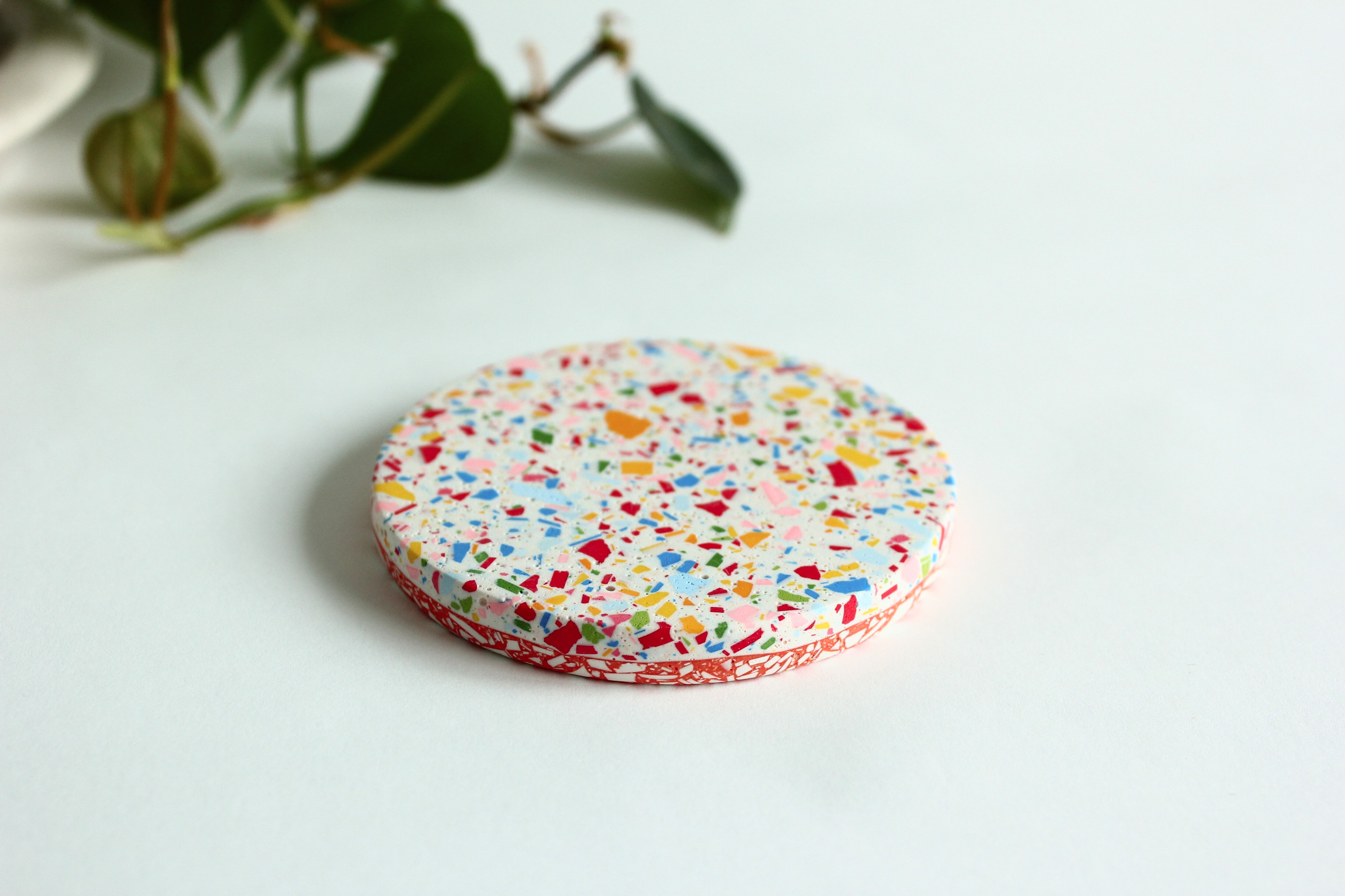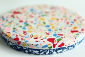 ジェスモナイトでできた、カラフルなコースター。