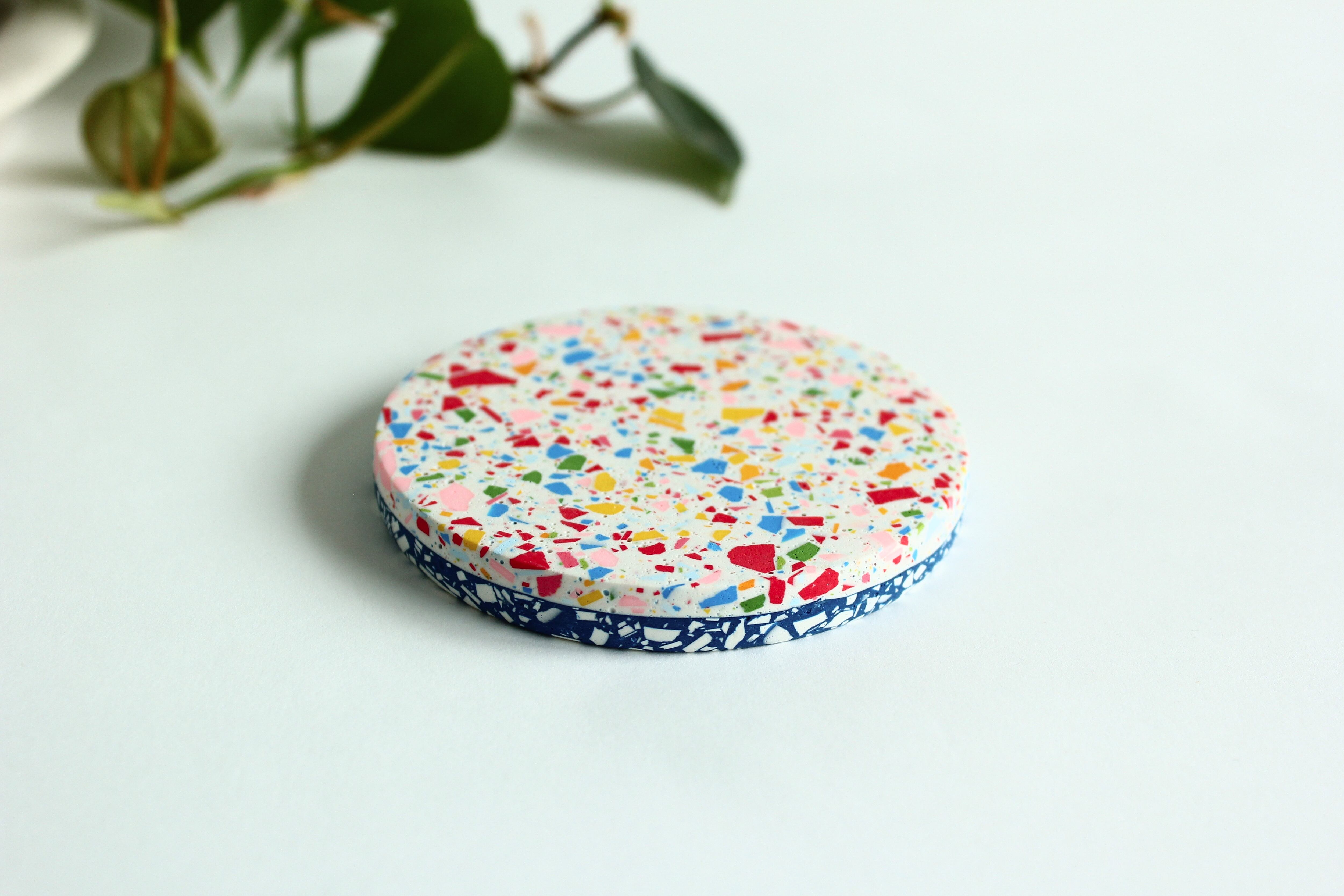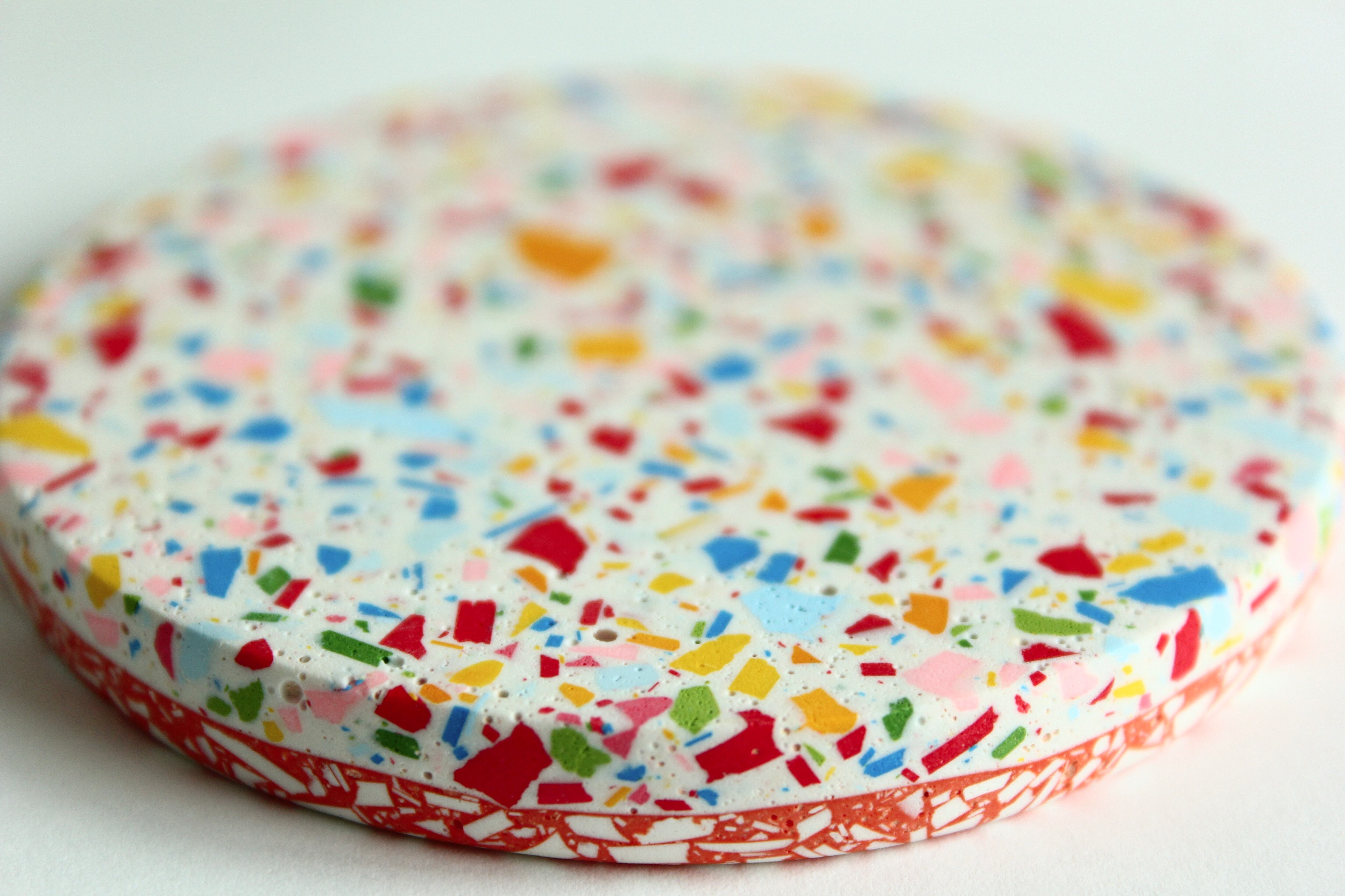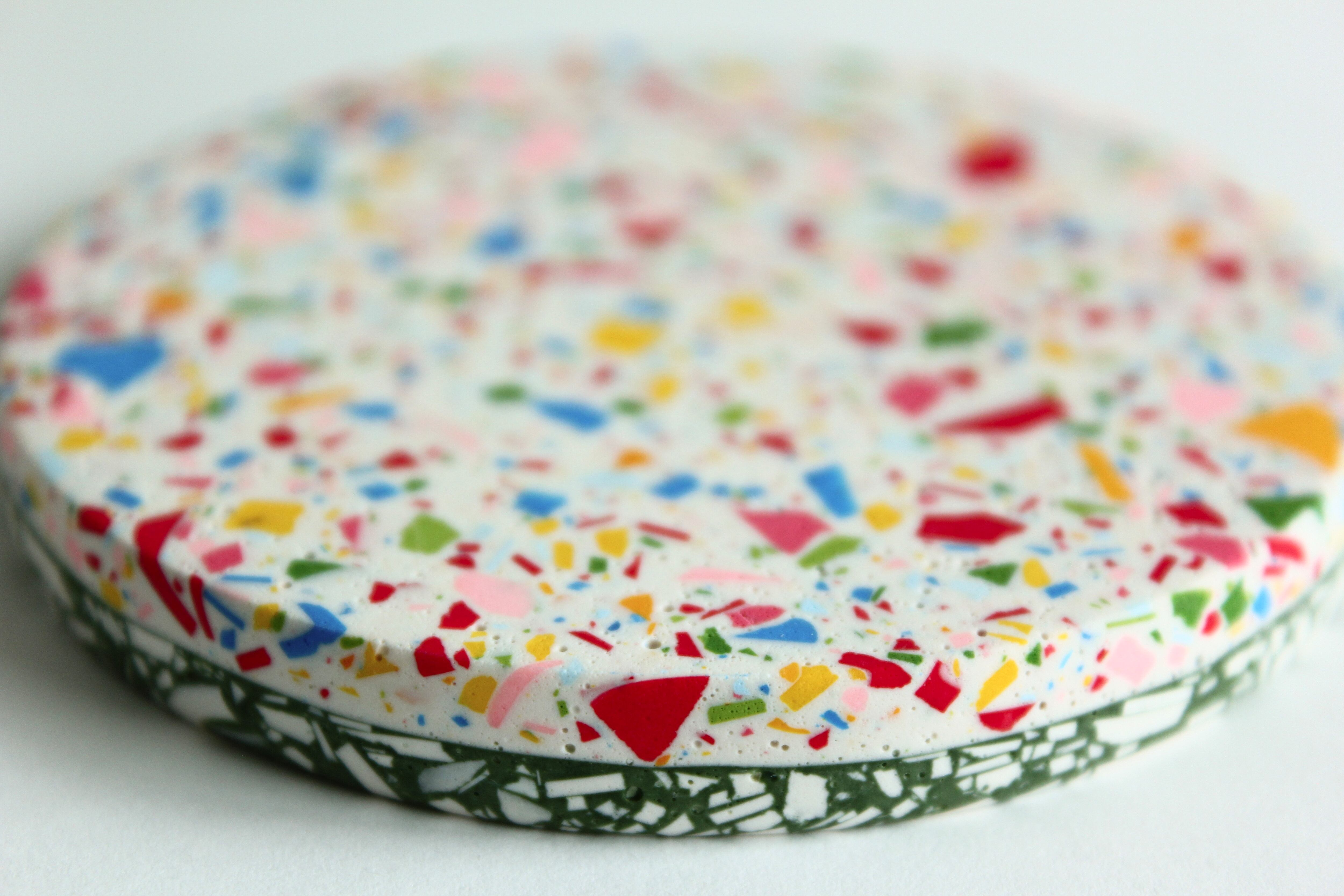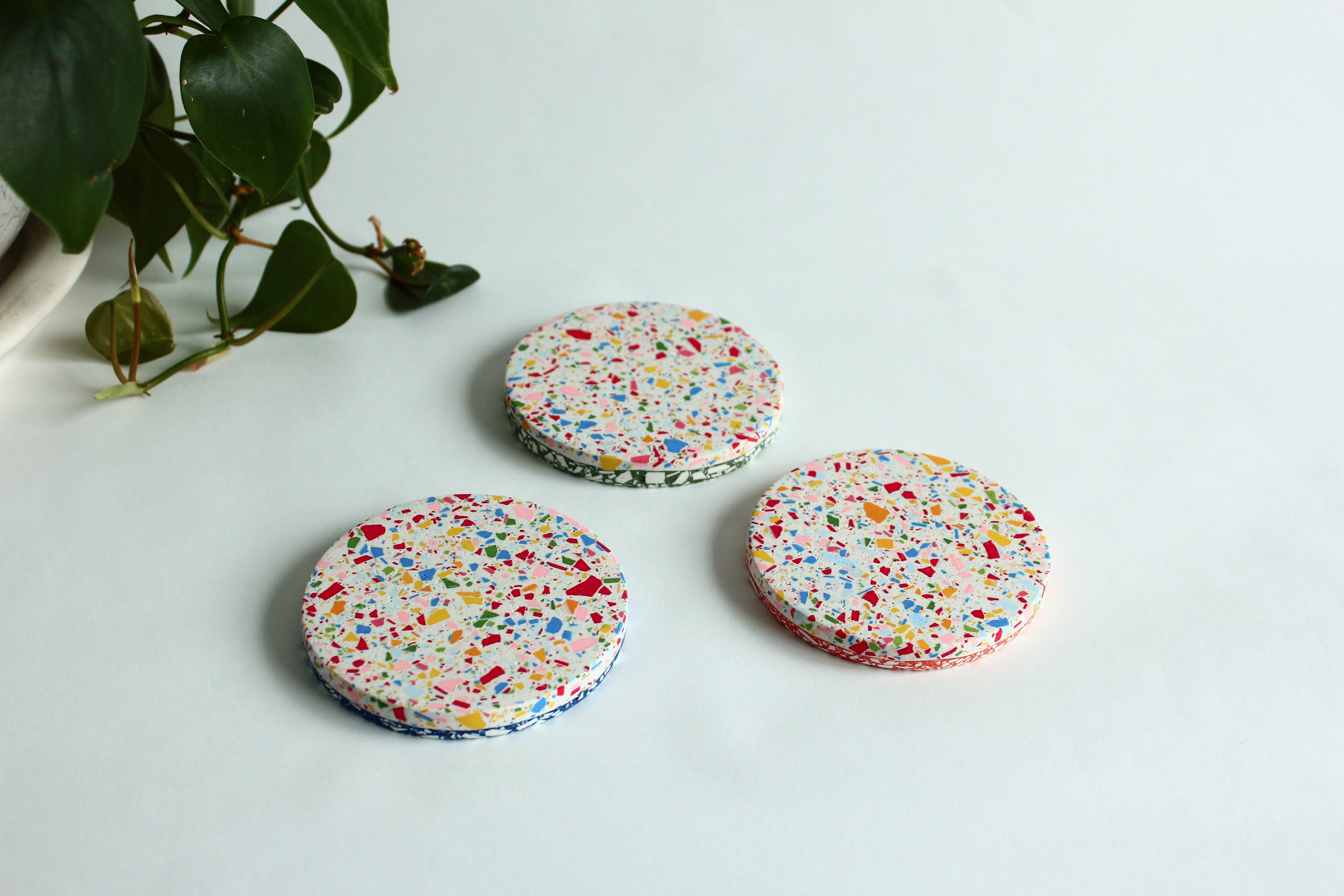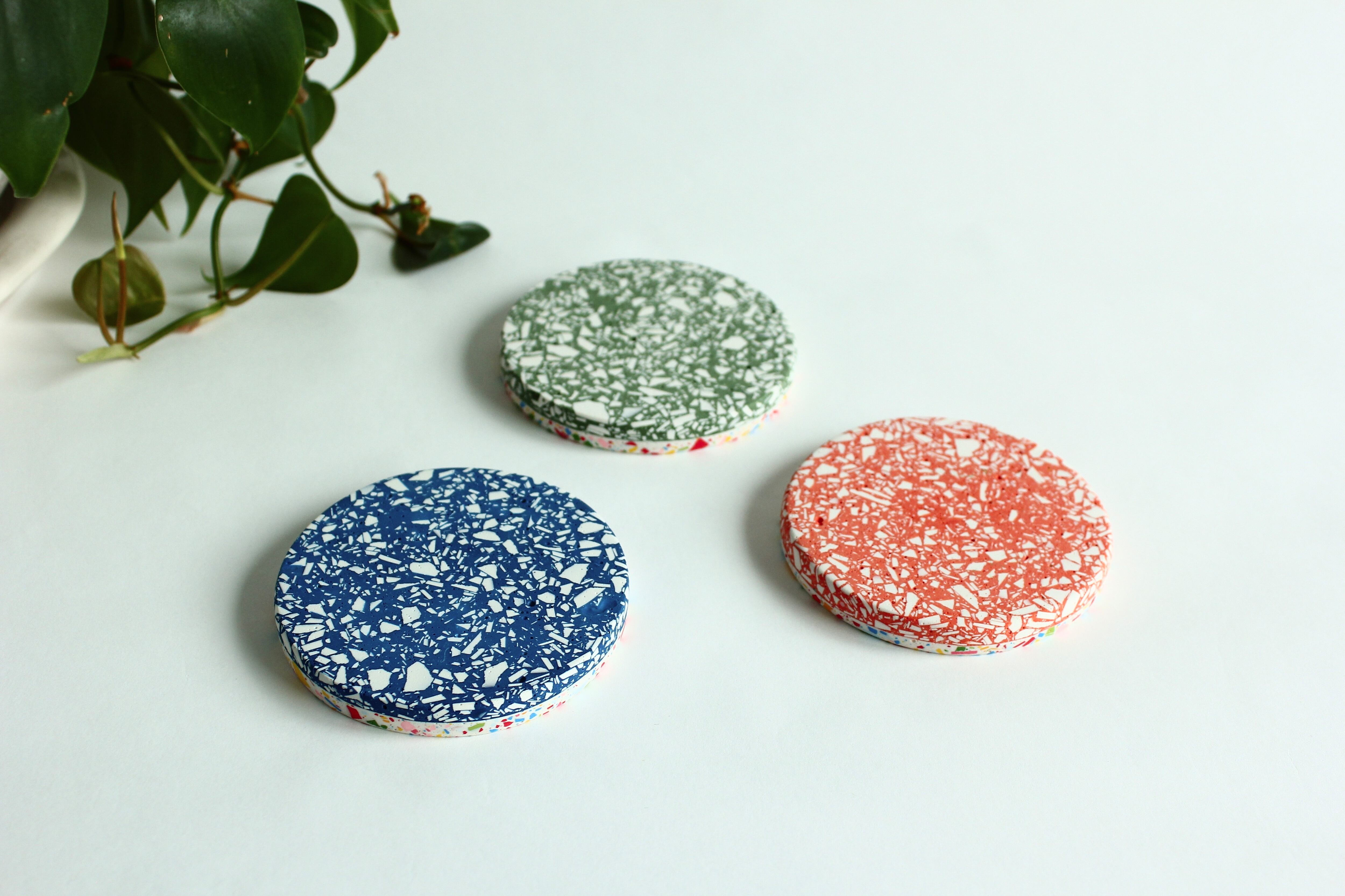 ジェスモナイトでできた、カラフルなコースター。