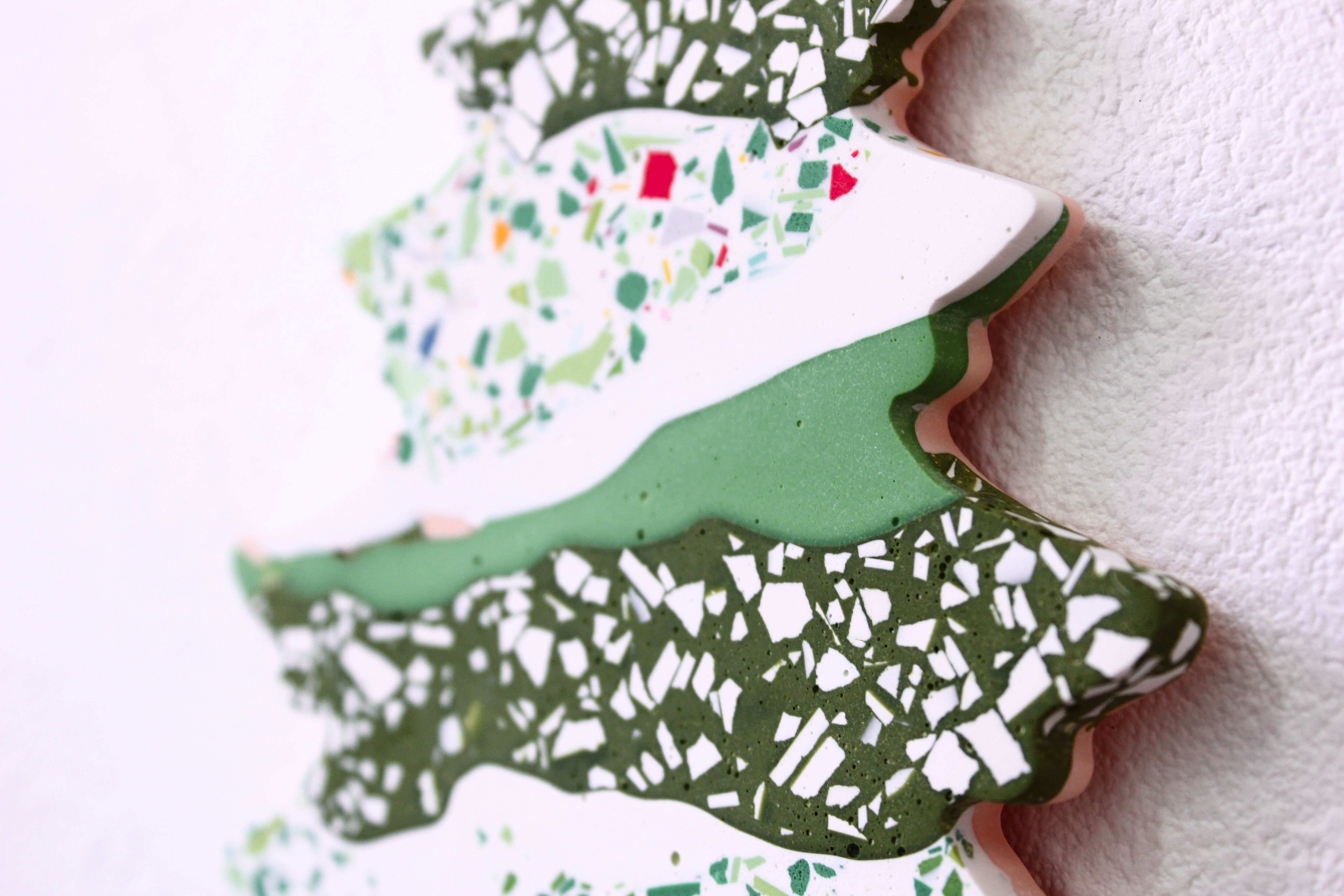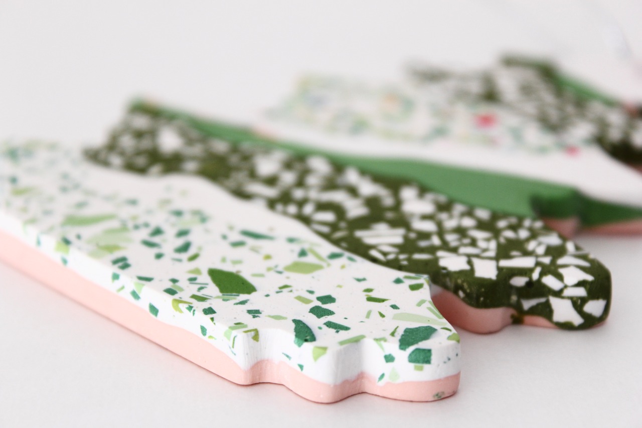 グリーンを基調に、ホワイトやカラフルなパーツがちりばめられ、自然な模様を作り出しています。「テラゾー模様」と呼ばれるこの模様は、削り出すまではどのような模様が現れるか、作り手にもわかりません。同じものは一つとしてない、どれも偶然生まれた模様です。