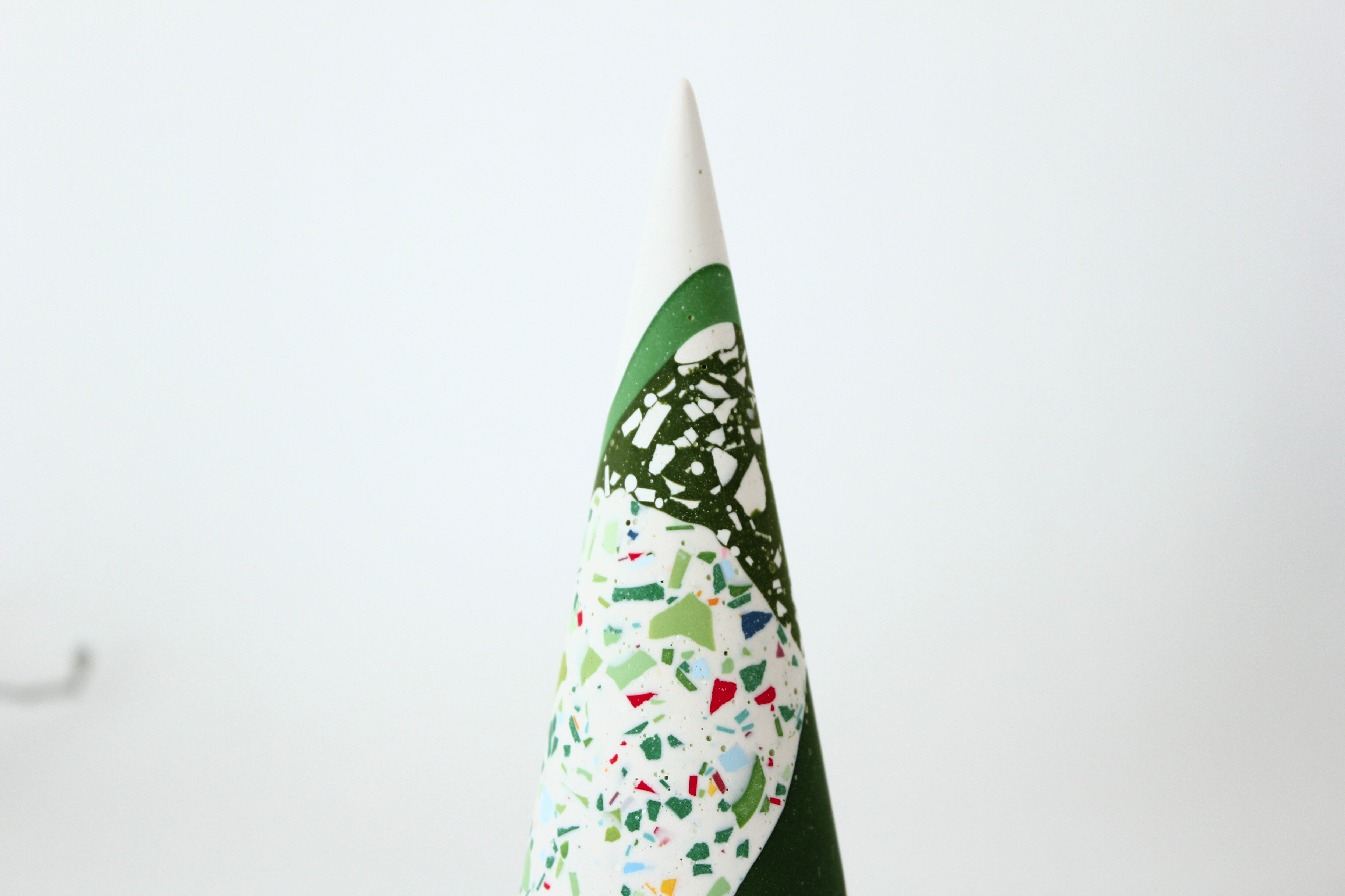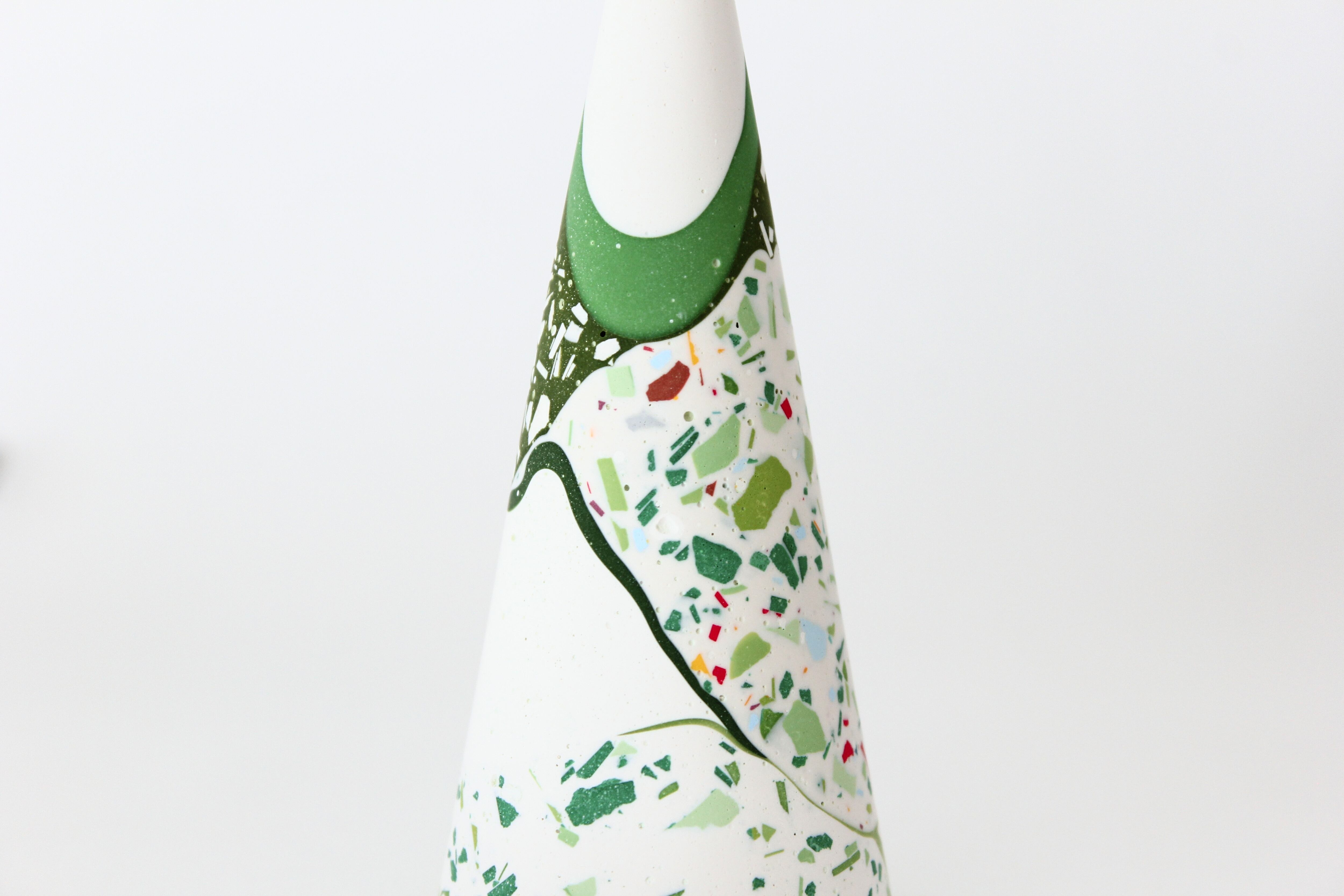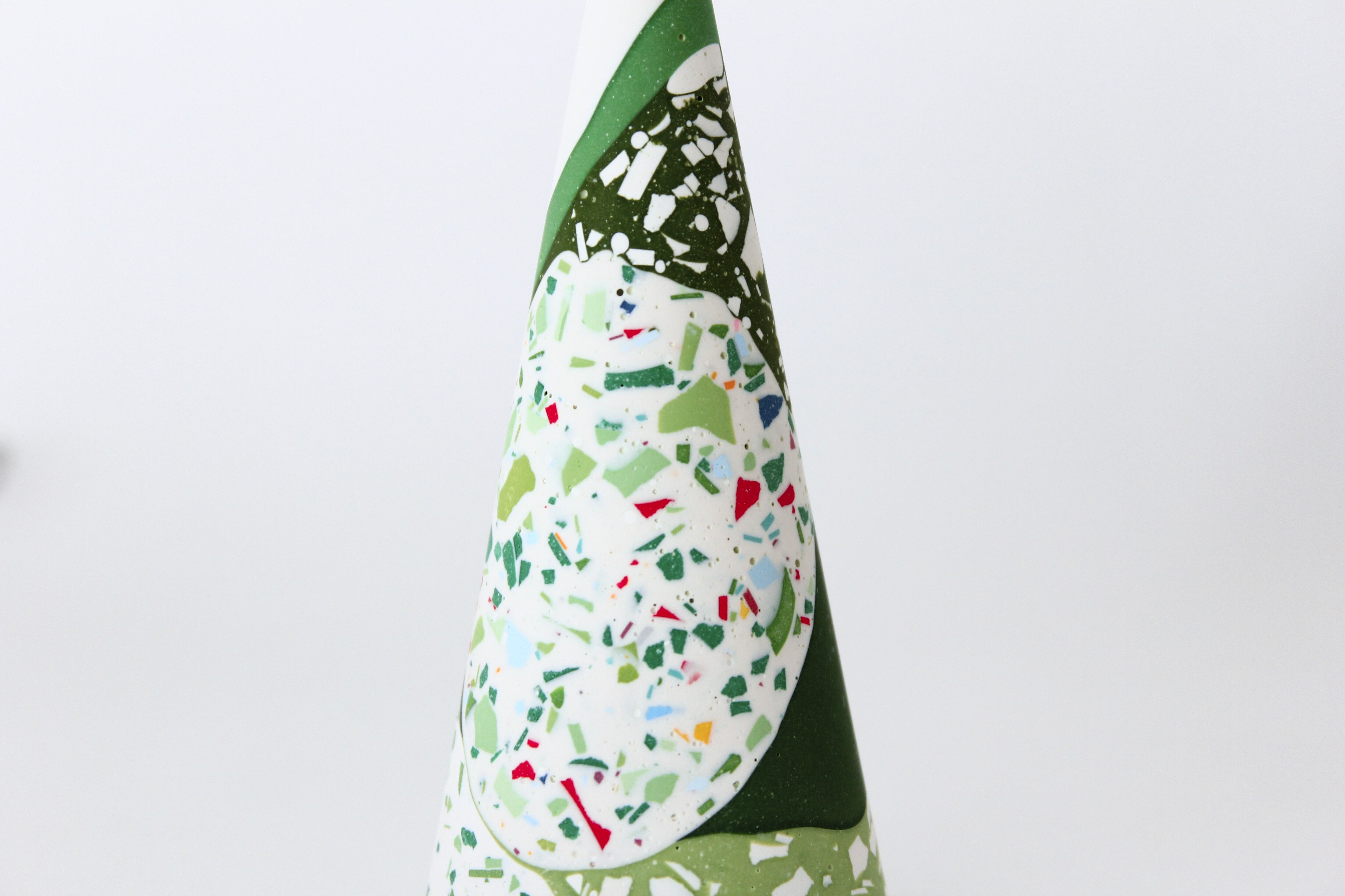 円錐形のシンプルなフォルムに、グリーンを基調としたカラフルなパーツがちりばめられ、自然な模様を作り出しています。