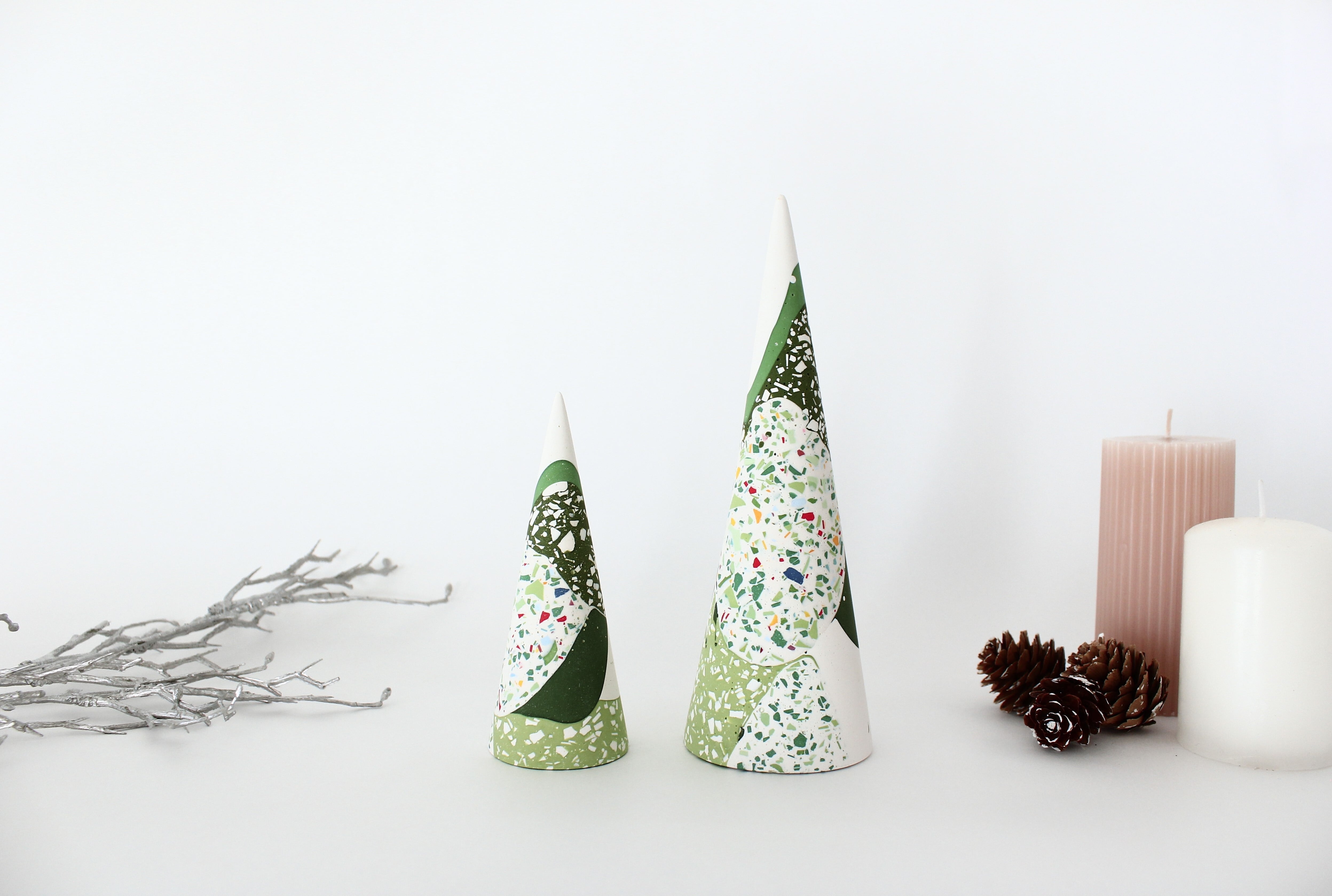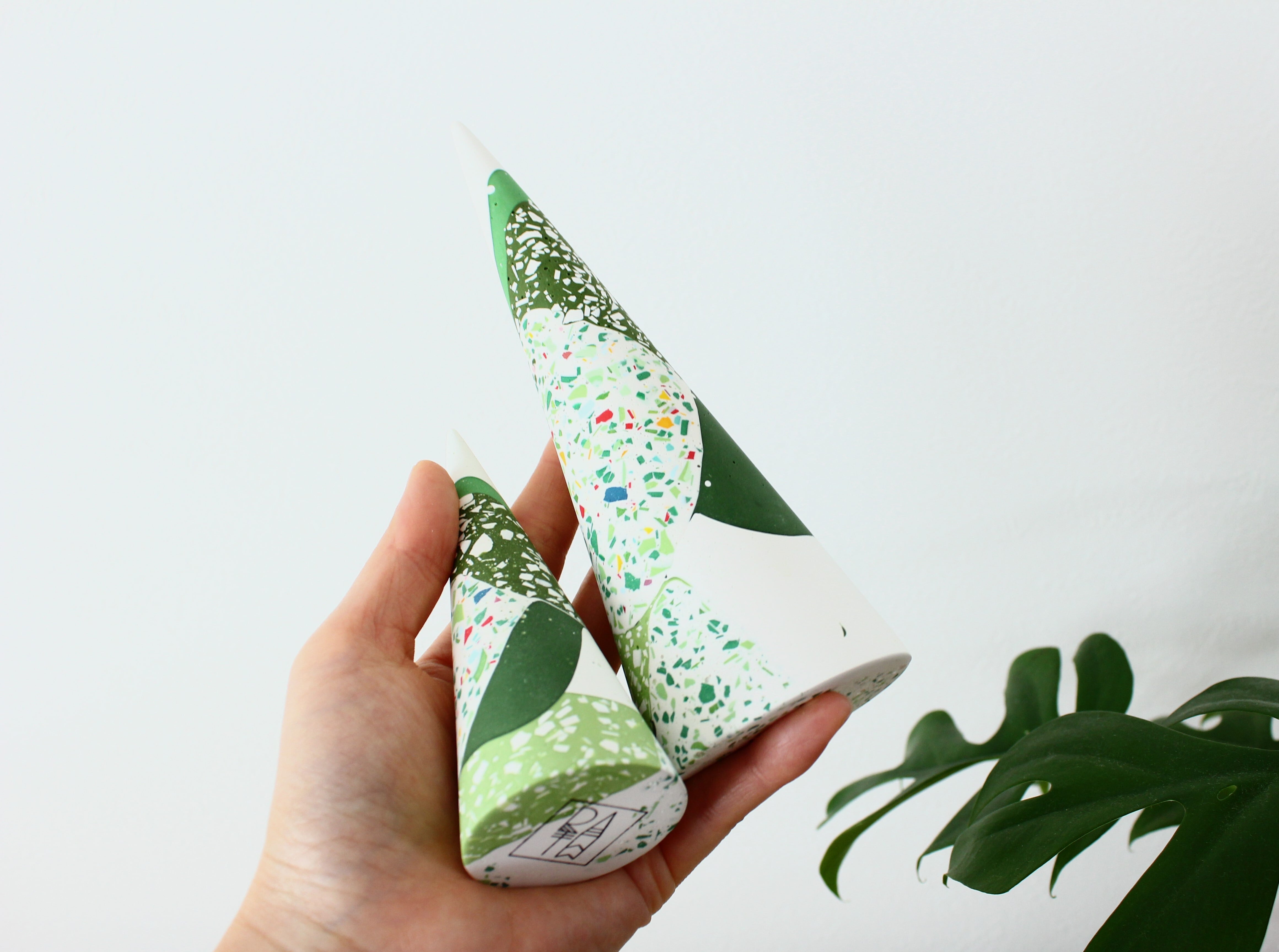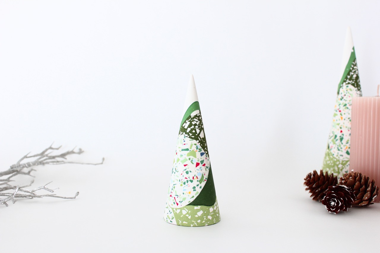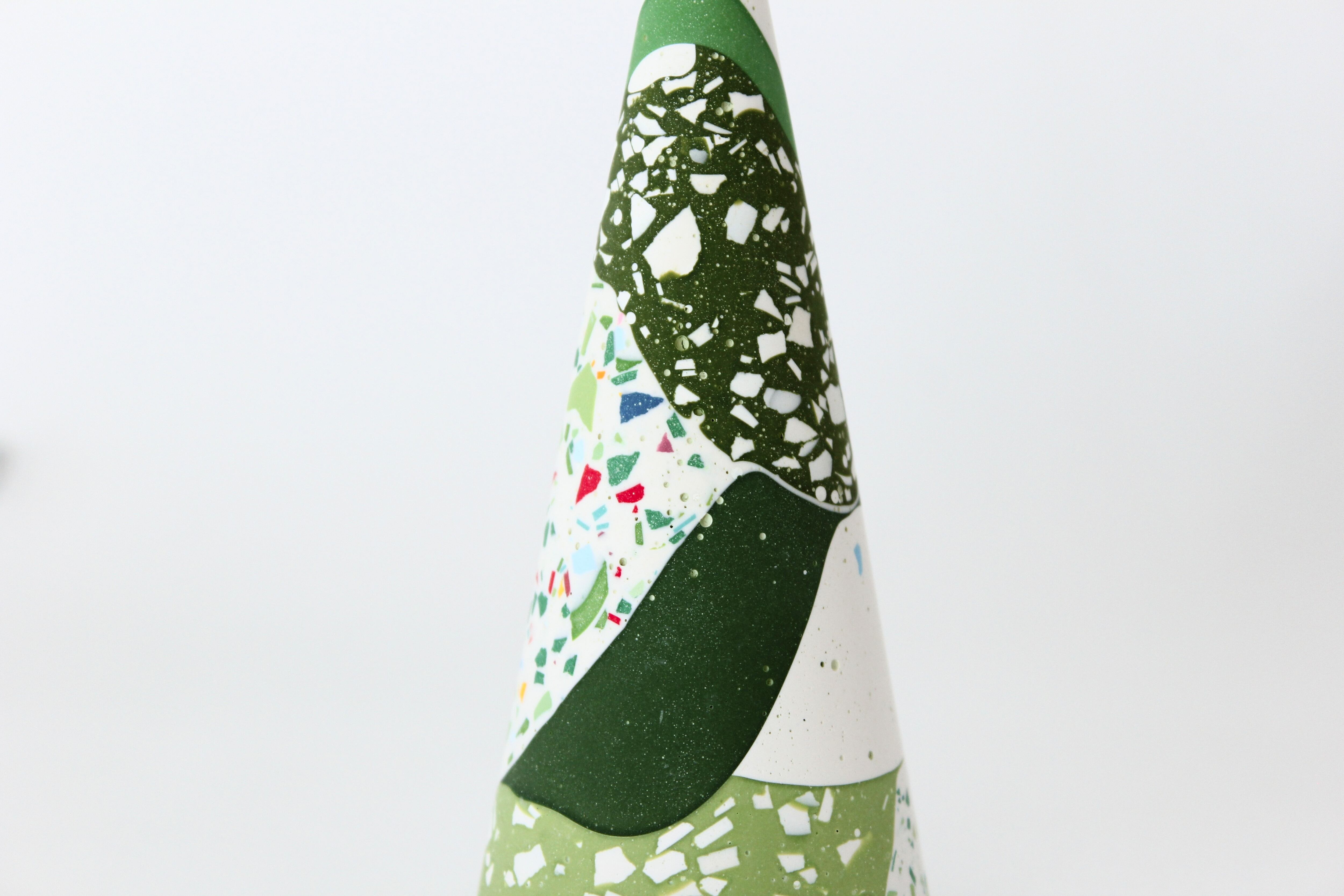 円錐形のシンプルなフォルムに、グリーンを基調としたカラフルなパーツがちりばめられ、自然な模様を作り出しています。