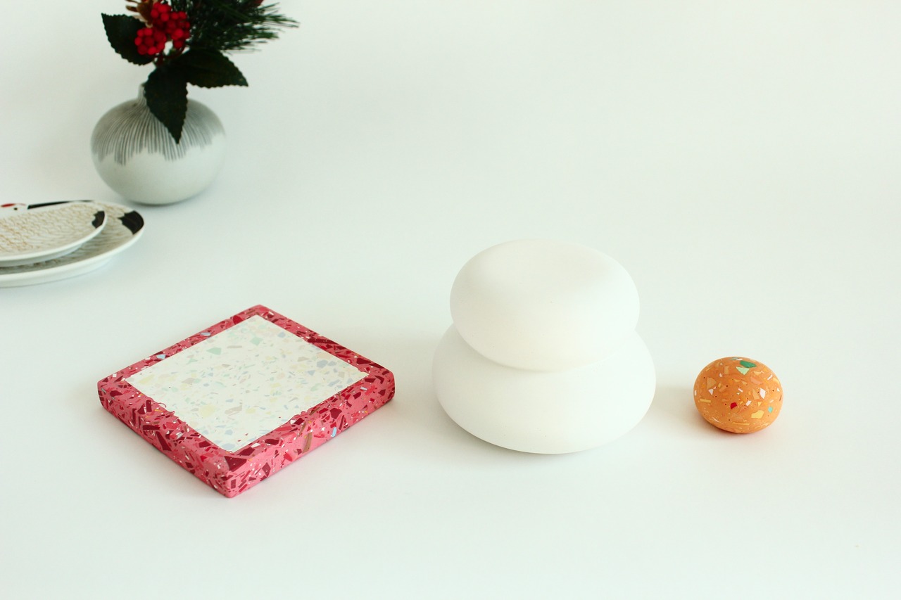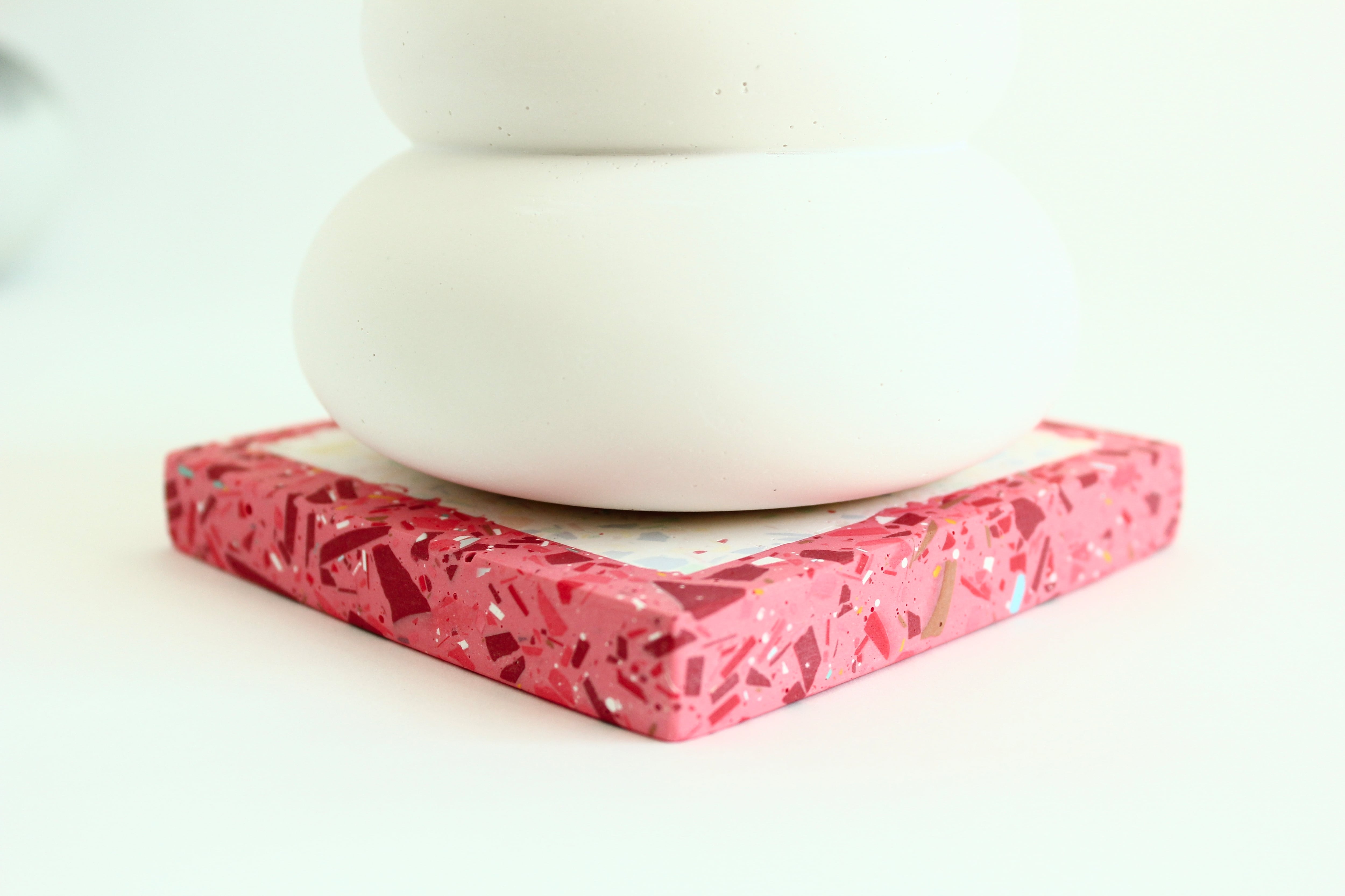 台座は白と赤を基調としており、同じくテラゾー模様を用いて作っています。