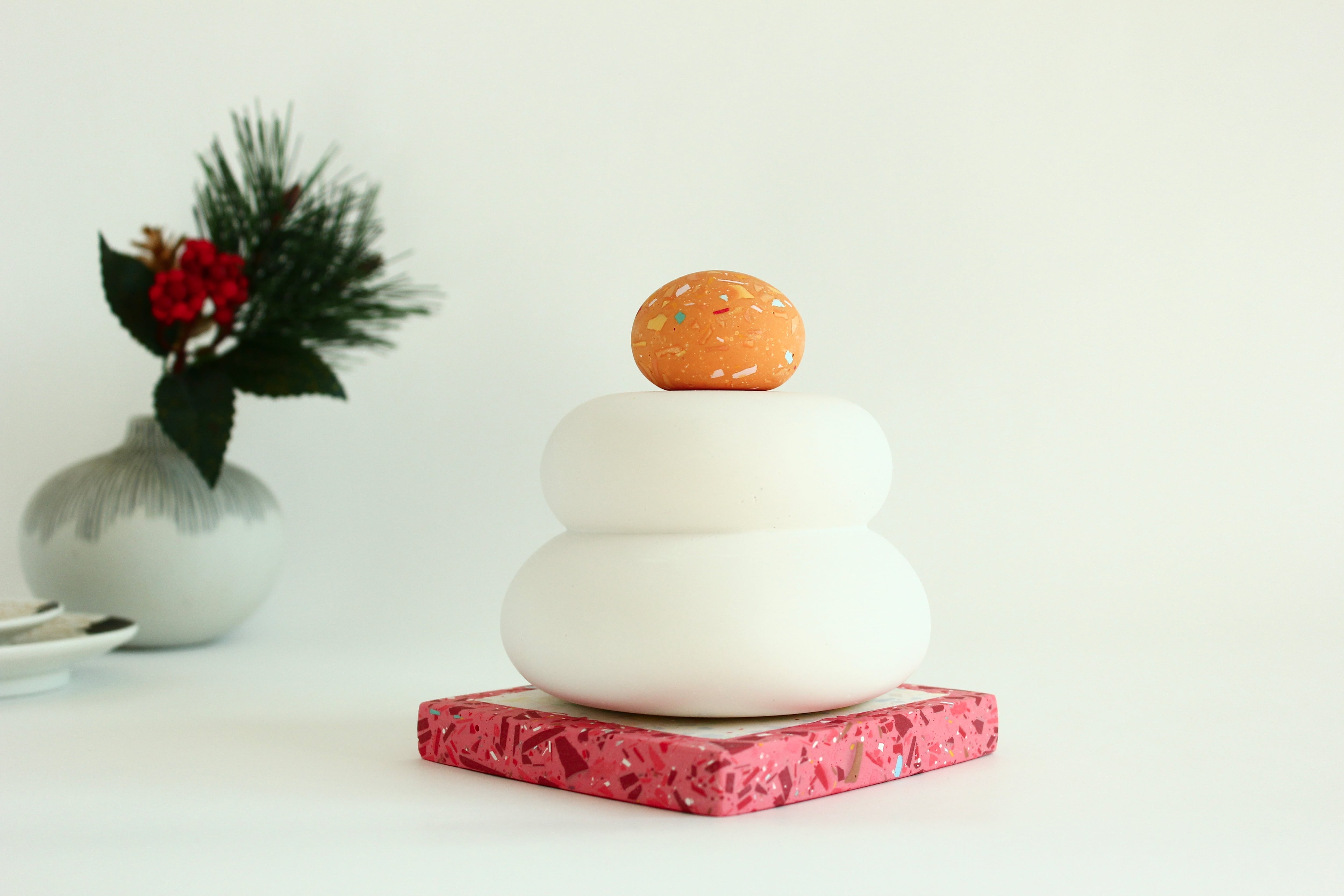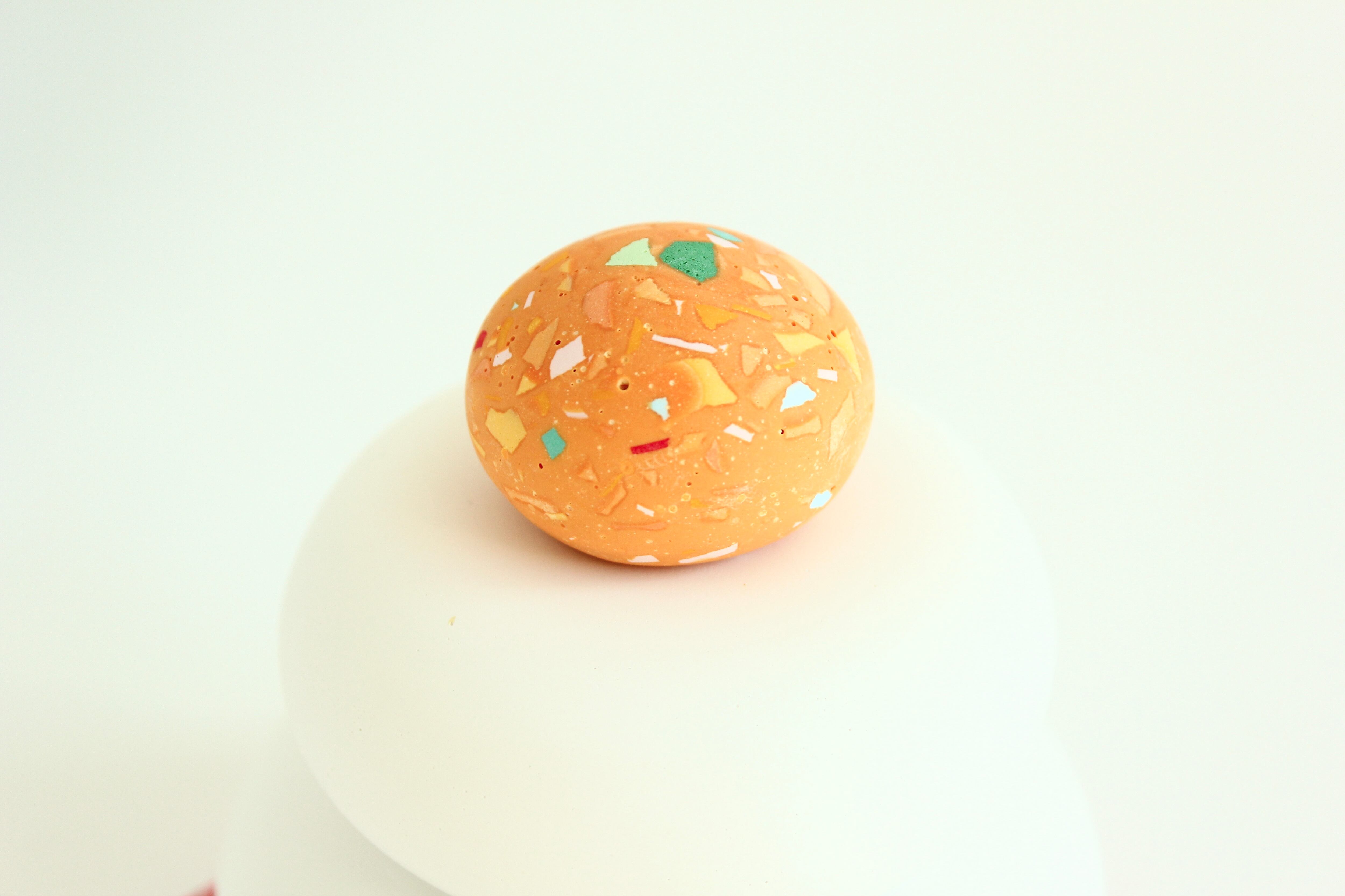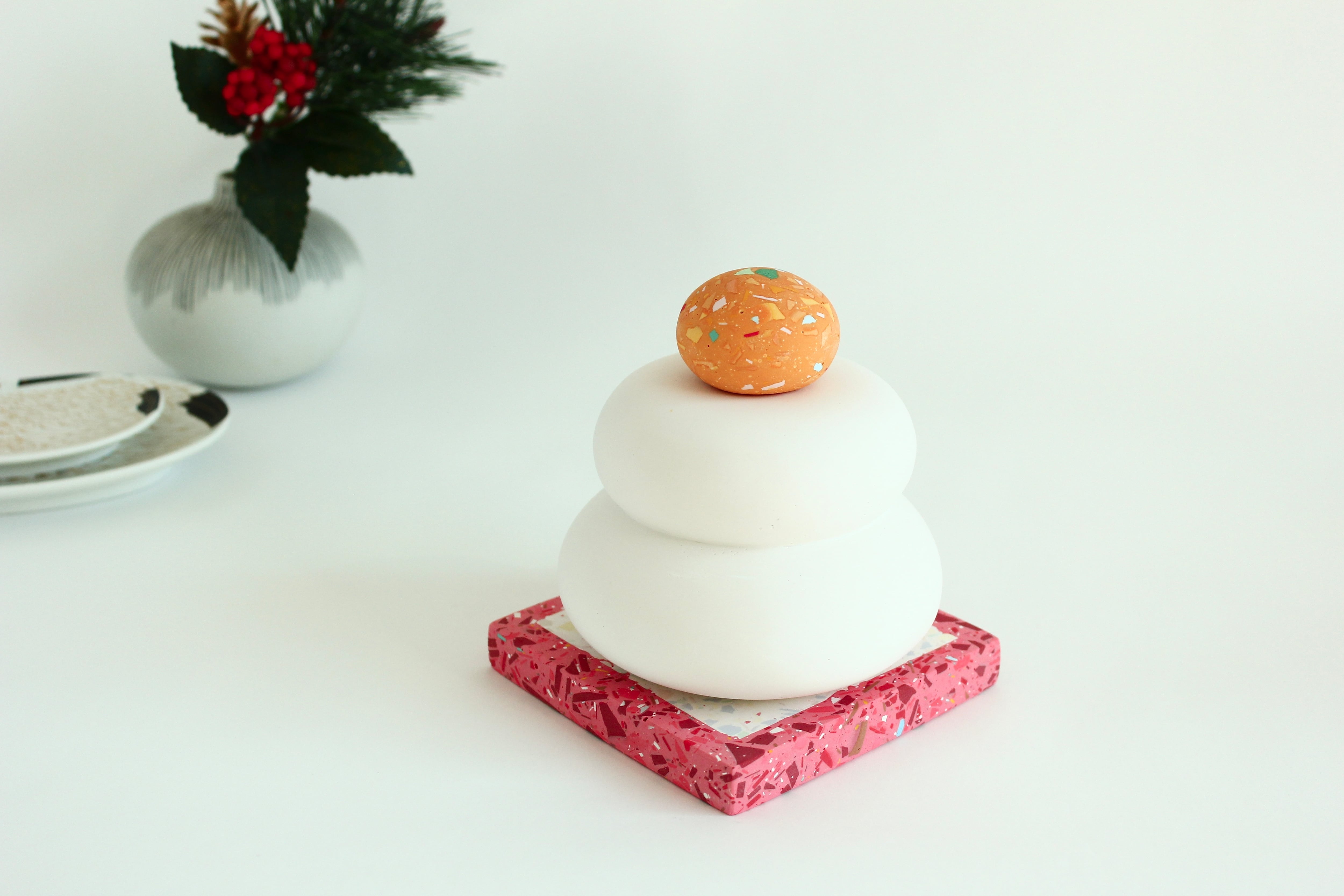 その上に乗っているみかんには、「テラゾー模様」という、細かなパーツをちりばめた模様が施されており、単色のオレンジ色では出せない表情を楽しむことができます。緑のヘタの部分も、このテラゾーで表現しました。