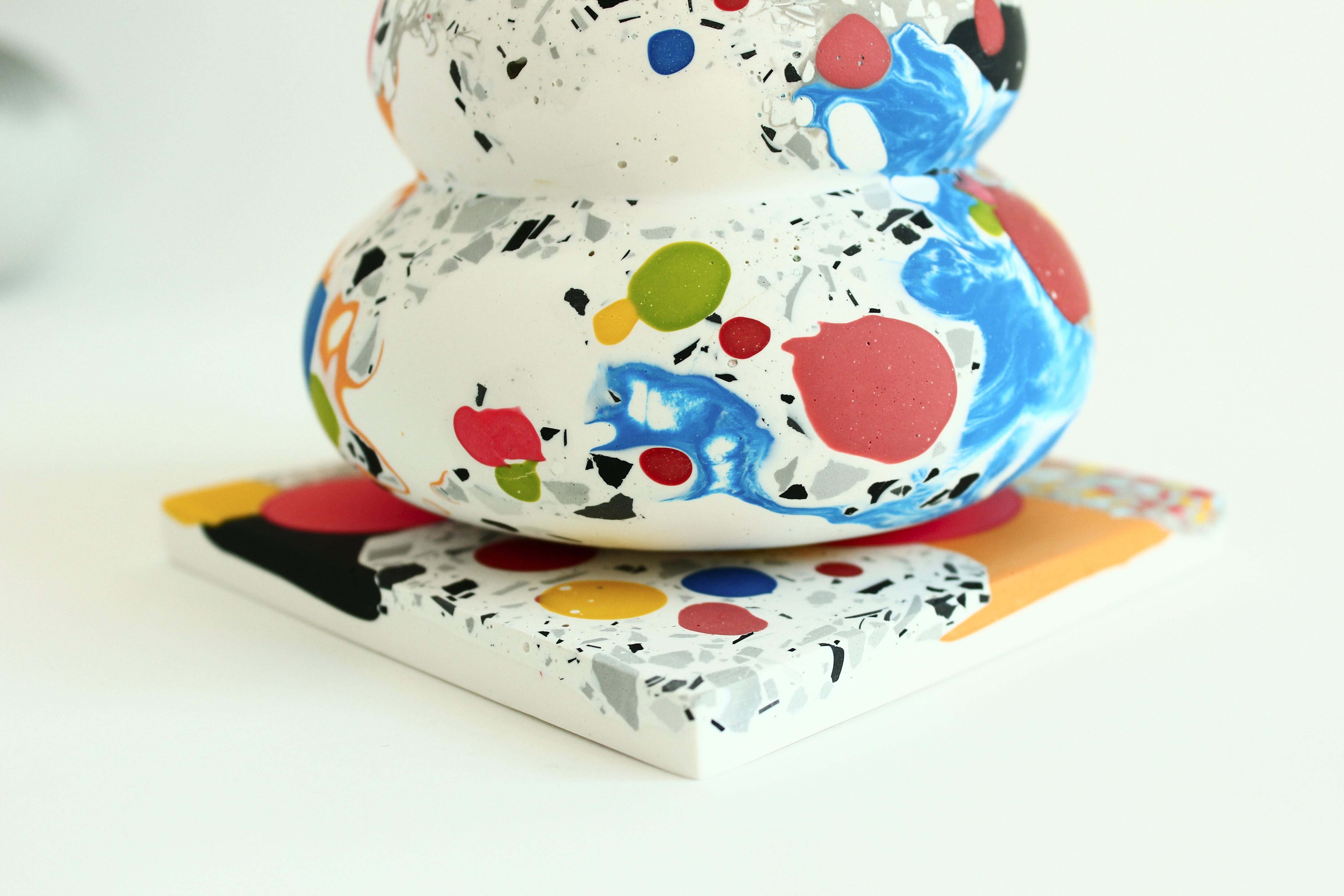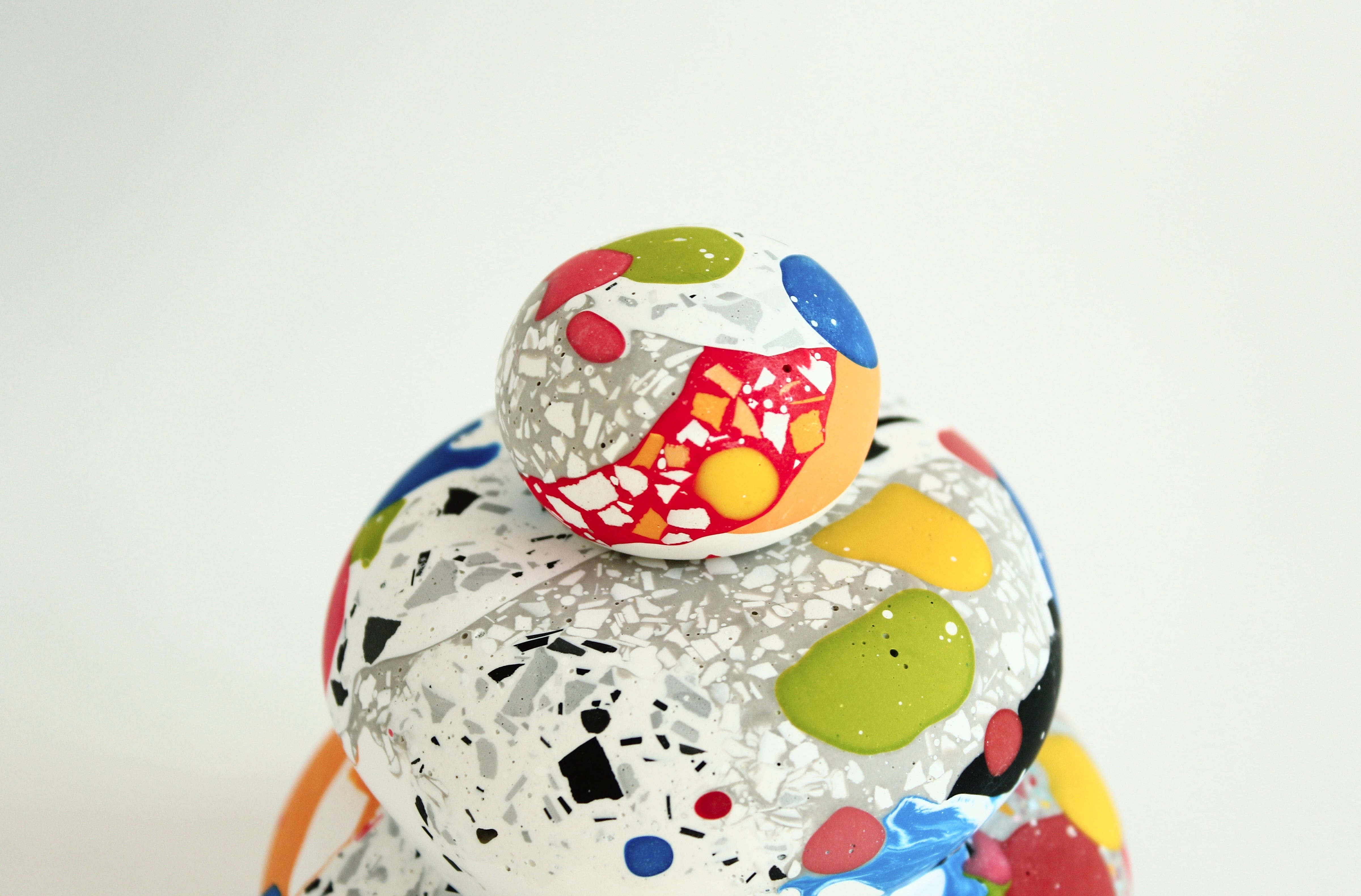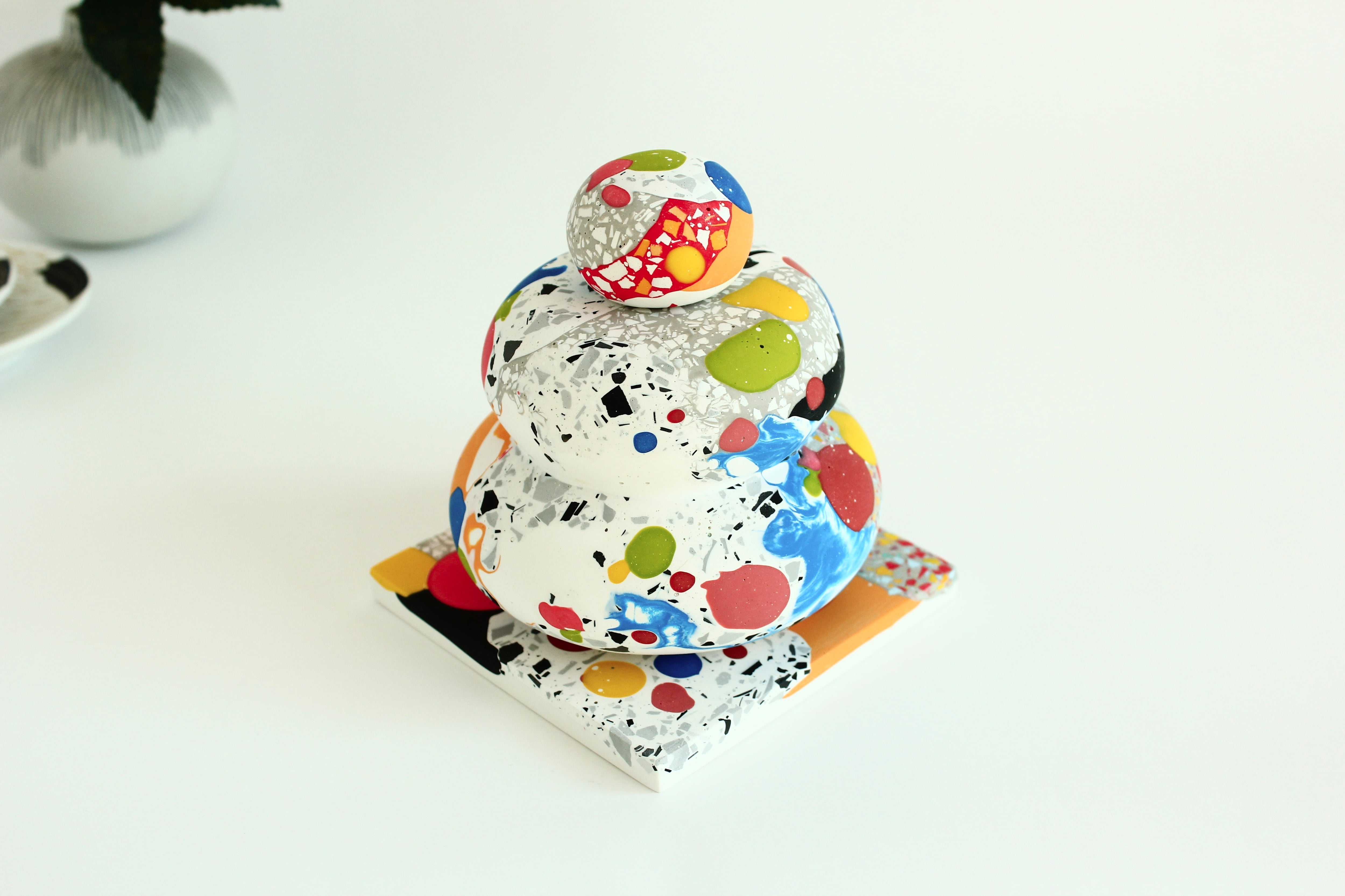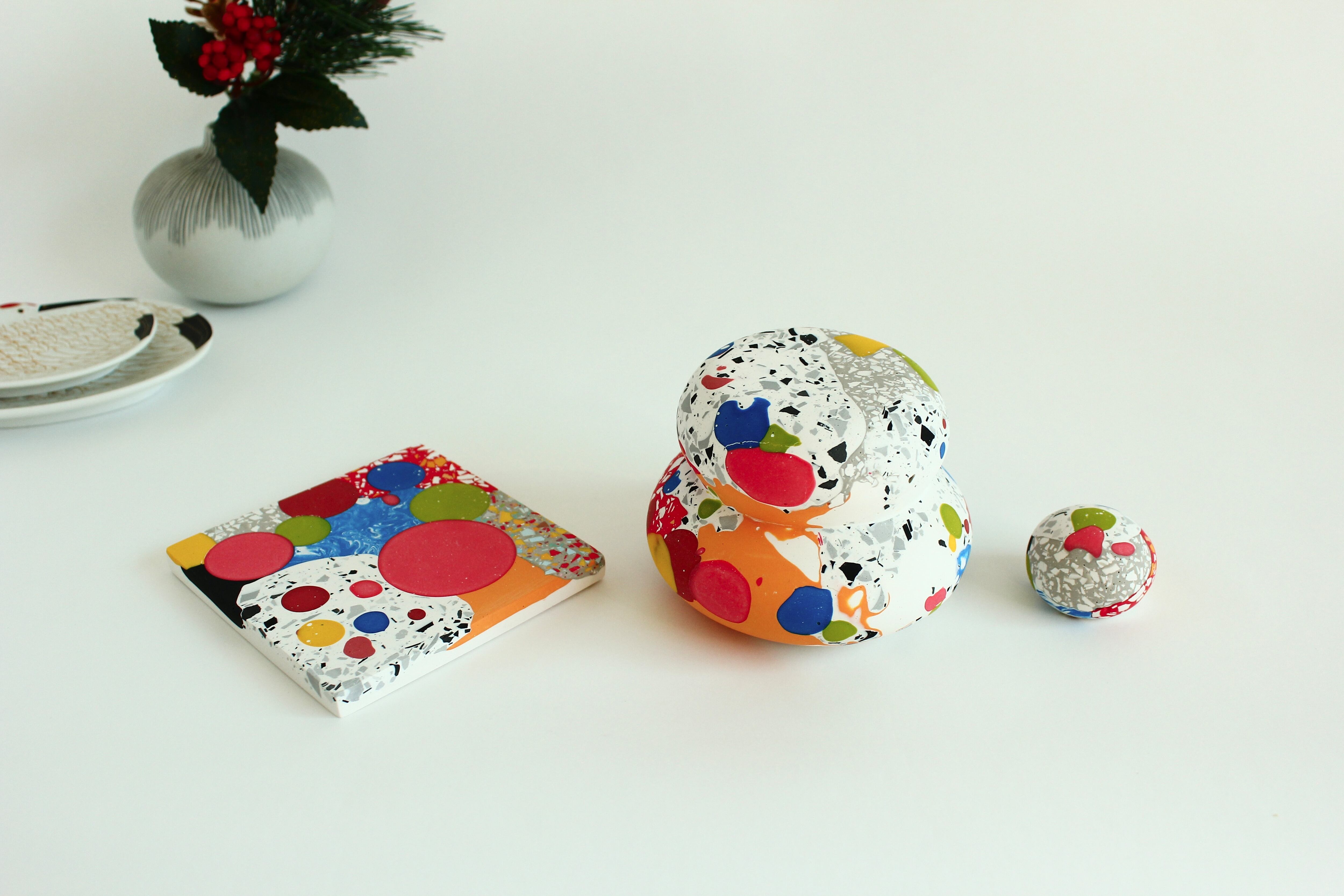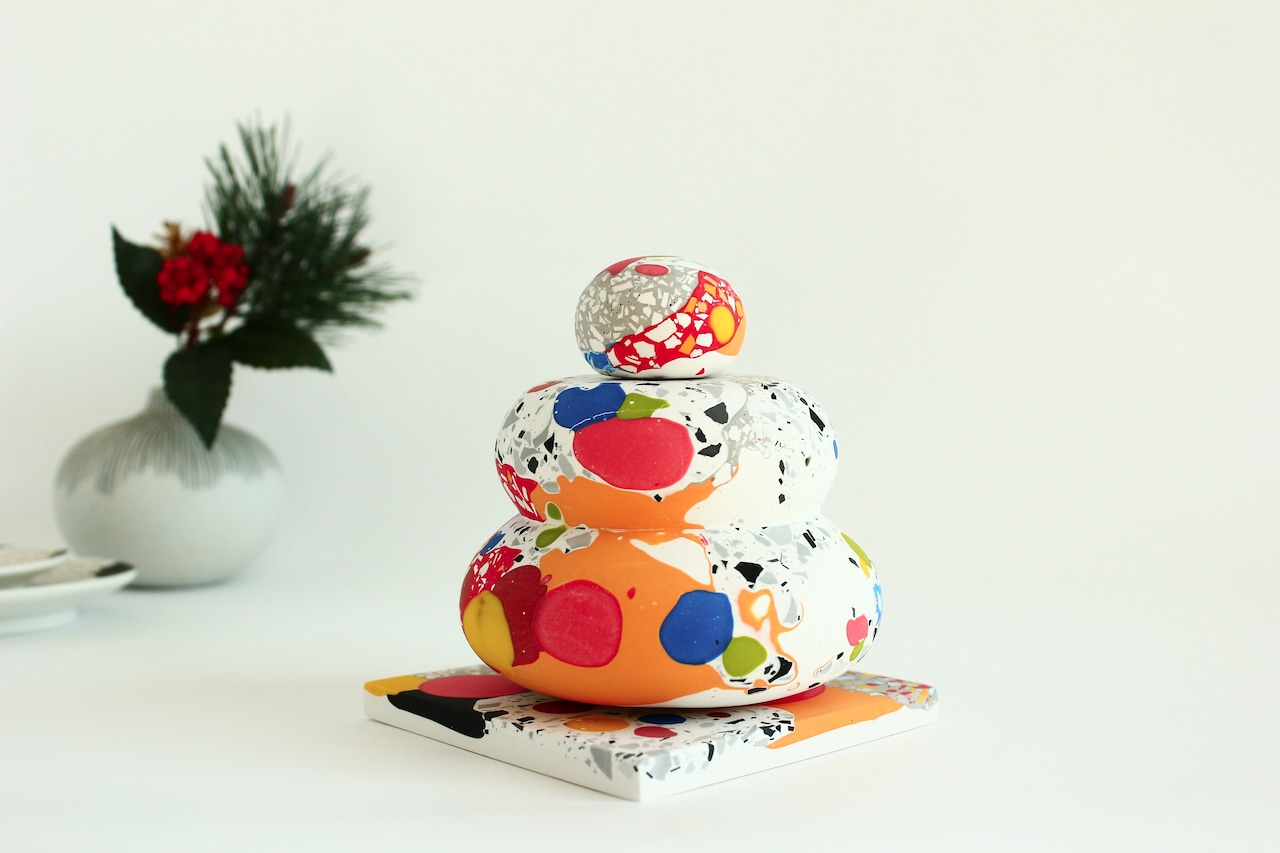 カラフルな模様の中には、絵の具を垂らしたような模様や、マーブル模様、さらには細かなパーツを混ぜ込んだテラゾー模様など、様々な表情を見つけることができます。